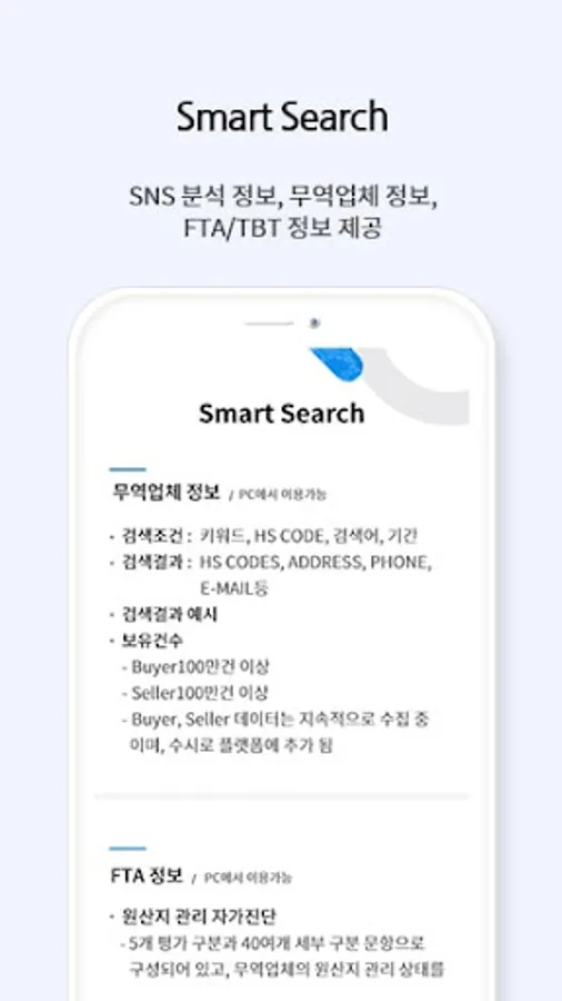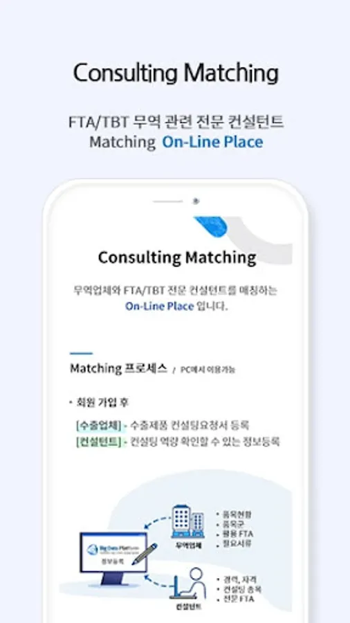 The FTA, TBT marketing platform is a big data-based smart consulting platform that provides Smart Search, Consulting Matching, consulting service, and archive service.