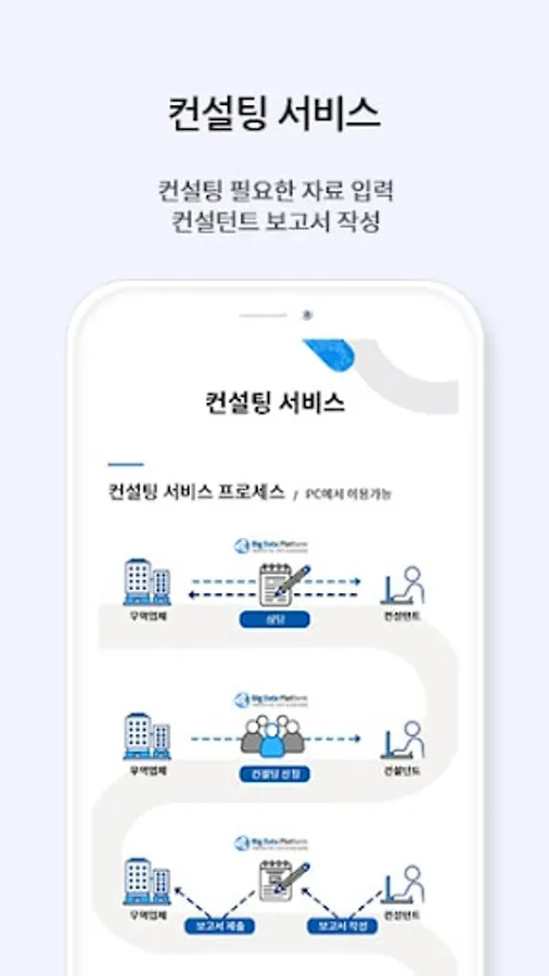 - Consulting request information: A service that matches the consulting request information registered on the platform by the trading company to export to the consultant, provides mutual consultation on the platform, requests consulting from the trading company, and prepares and submits a consulting report that meets the requirements of the consultant