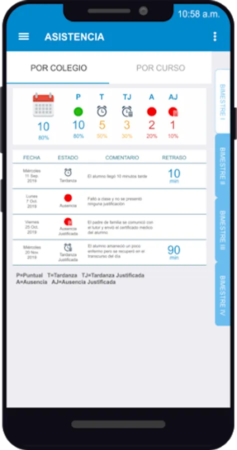 - Know the punctuality of your child in real time according to the time of arrival at school.
