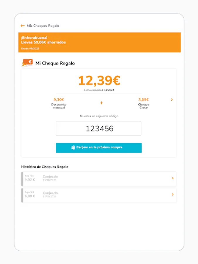 • Check your Gift Certificate with a single click. At any time you will know how much money you have accumulated in your Gift Certificate, in addition, if you receive it from the online channel, you will be able to enjoy it before (the 15th of each month). With the Consum gift voucher you will get discounts according to the amount of your purchase. You always win!