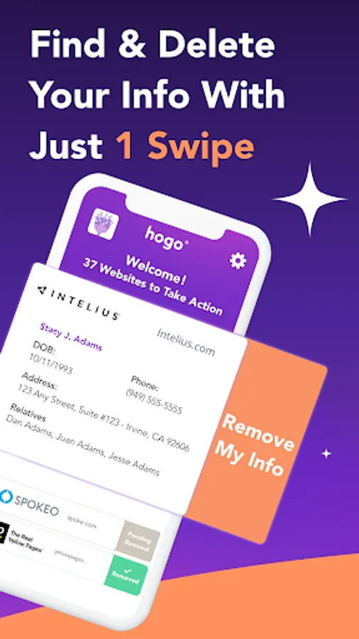 Identify data trafficker sites: see what personal information they have on you and your family & remove personal information like your address, phone number, family members, and location data with ONE SWIPE.