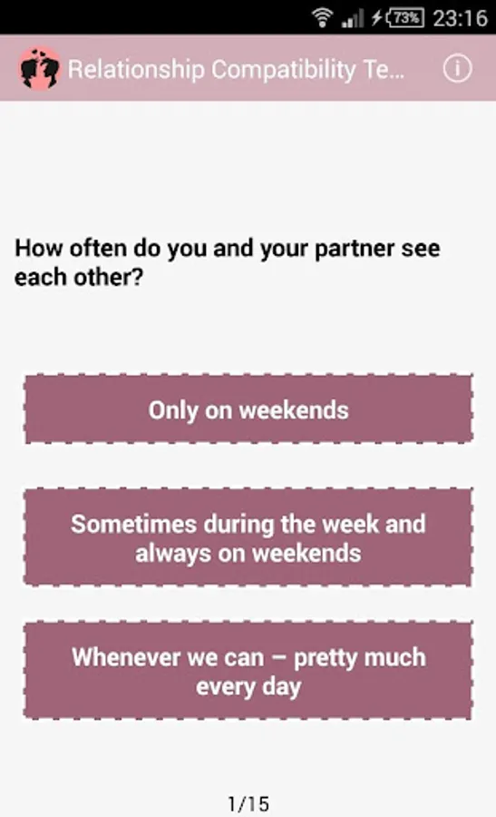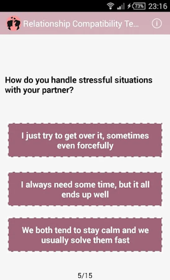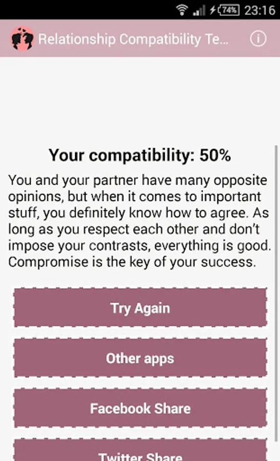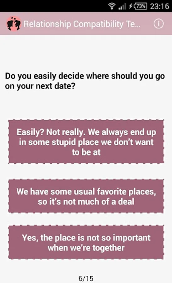 Wondering if you and your boyfriend or girlfriend are compatible? Then you should try this short Relationship Compatibility test for couples. You will have to choose between different questions, for example how often do you see each-other, how easily do you decide on what to do and where to go, how well do you handle stress and so on, and will get your compatibility score and a short explanation.