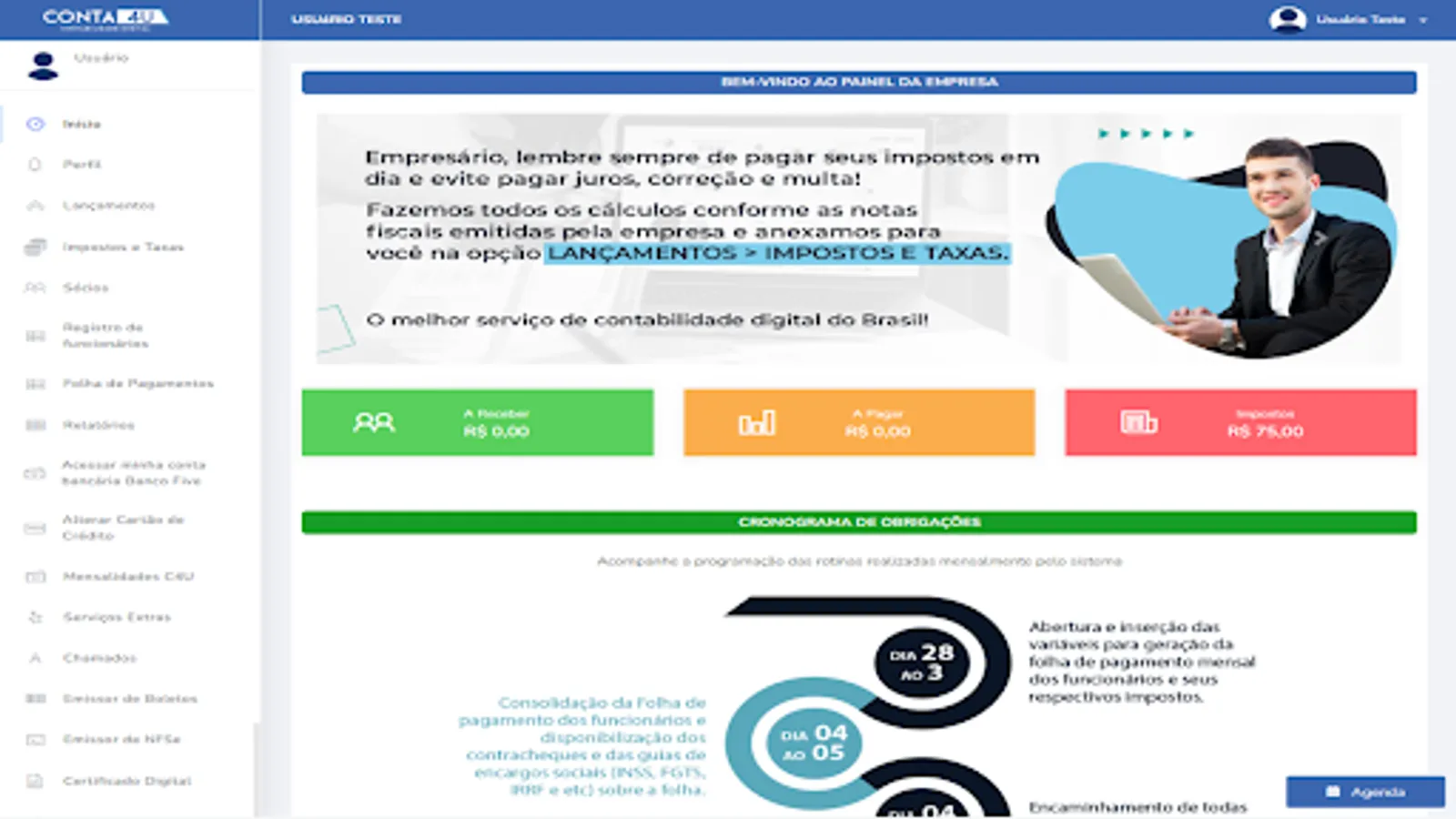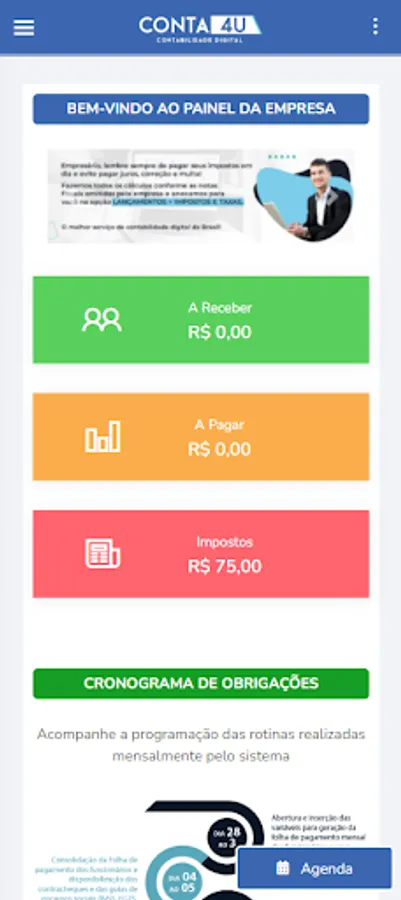 Conta 4U is the solution for you looking for practicality, agility and simplification for the management and accounting of your business. You have at your disposal the best for your company. Directly from your cell phone, tablet or computer, you will do, through a simple and easy-to-use dashboard, all the accounting activities you need.