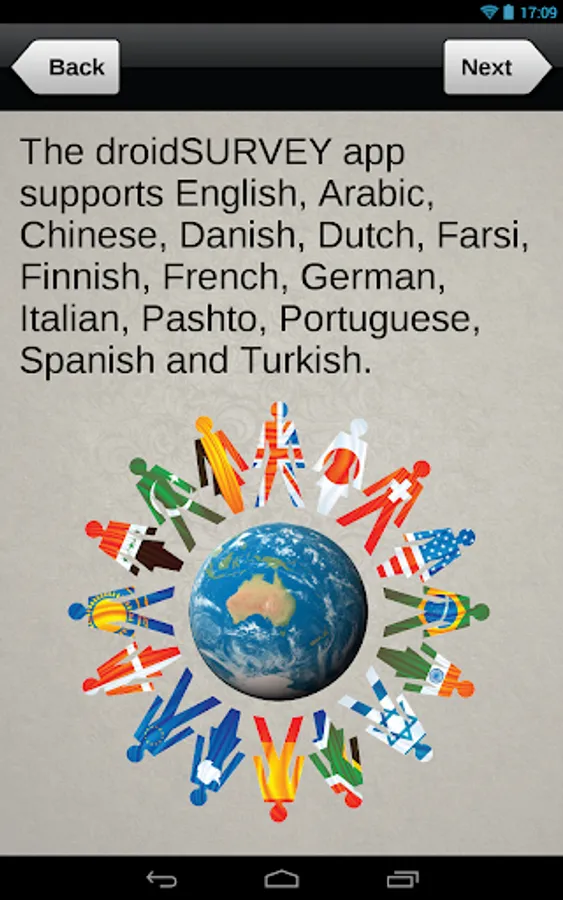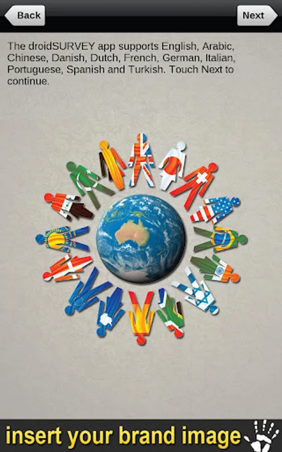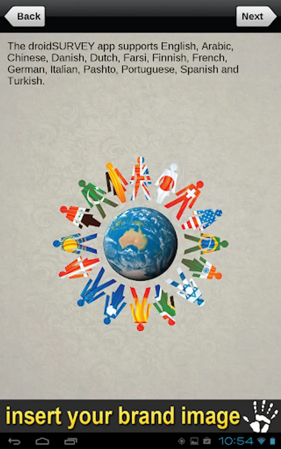 - MULTILINGUAL: The Droid Survey App supports Spanish, Danish, German, French, Portuguese, Arabic and English.