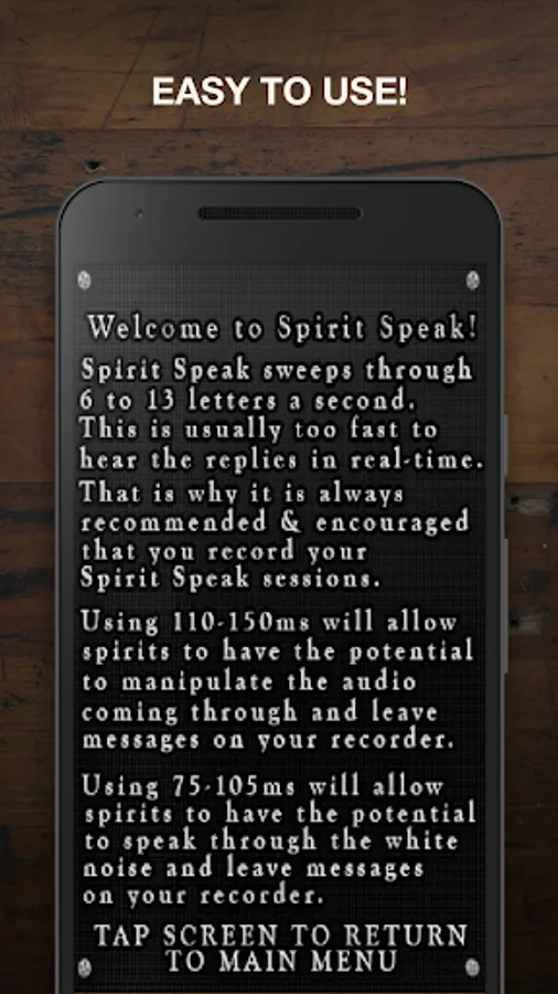 Spirit Speak - Reversed uses all of the audio from the original Spirit Speak app, except the letters have been REVERSED! Spirit Speak - Reversed does NOT play the same audio files over and over from prerecorded "banks". Most of these "Ghost Box" apps are full of "banks" of audio that have full word replies, usually taken from audio sources that mention things relating to the afterlife. Other Ghost Box apps scan internet radio stations, that are talking about the paranormal! Some of the apps are literally playing the same 30 minutes of audio over and over on a loop. Spirit Speak - Reversed leaves out all of that nonsense! No one wants fake replies.