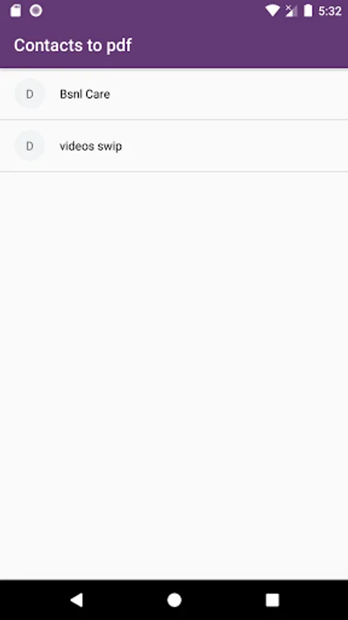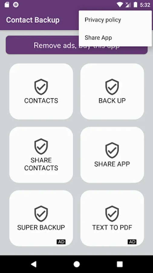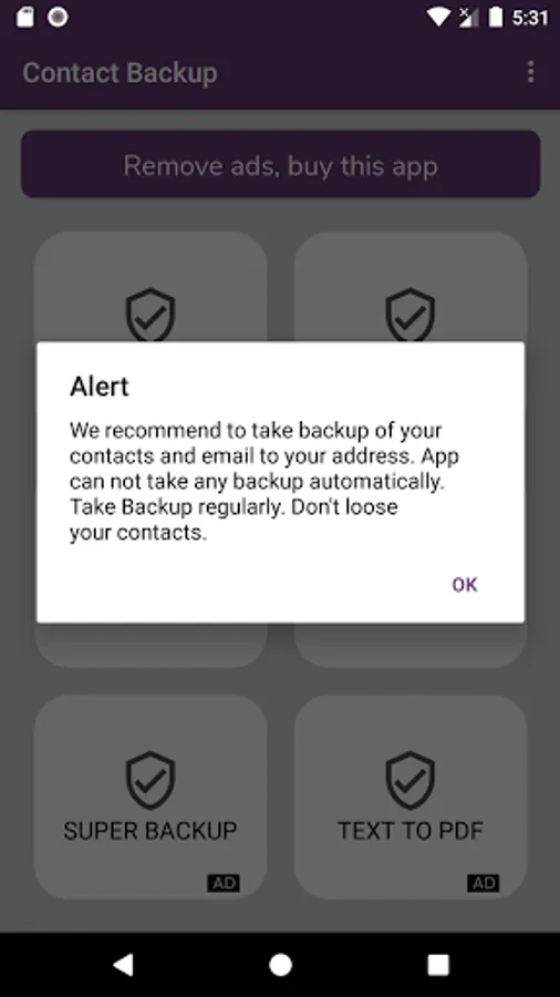 This application help you to take your contacts backup in cvf and pdf files. You can share these files with facebook , whats app email and much more. You can also create single or multiple contacts txt files. You can also remove ads by purchasing this application. or enjoy this application also free with ads.