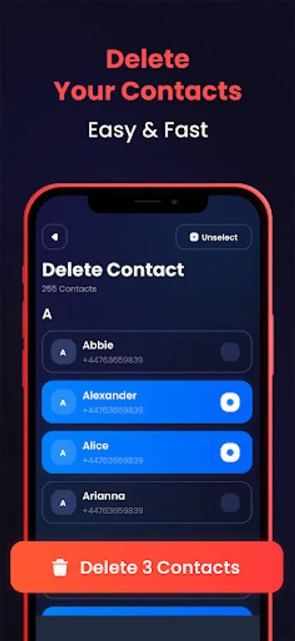 Deleting contacts is now easy with our Contacts backup and merge app.You can select the numbers you want to delete individually or select them in bulk and perform the number deletion process.You can delete contacts that you no longer want to be in your contacts.
