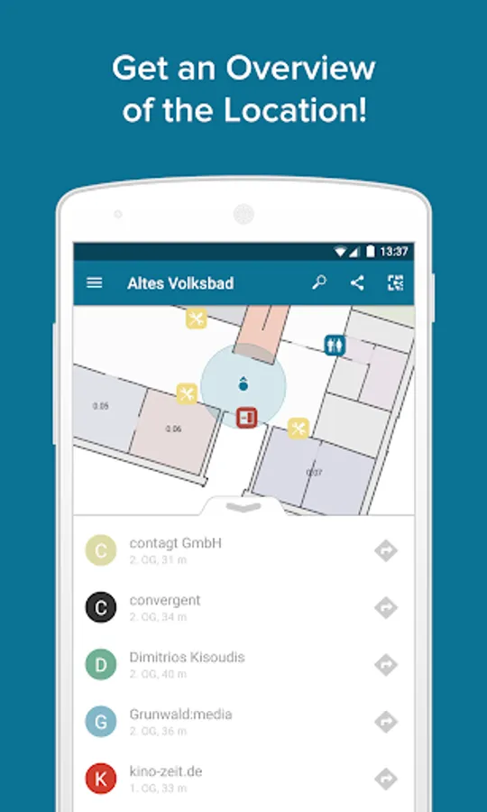 Indoor navigation made easy! Are you looking for a specific office space? You want to find the closest bathroom? Or you are not sure where you parked your car? With contagt these questions are a thing of the past!