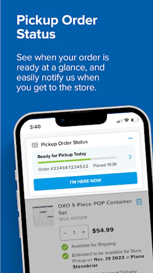 Enjoy simple tracking of your store pickup orders. See when your order is ready at a glance, and easily notify us when you get to the store.