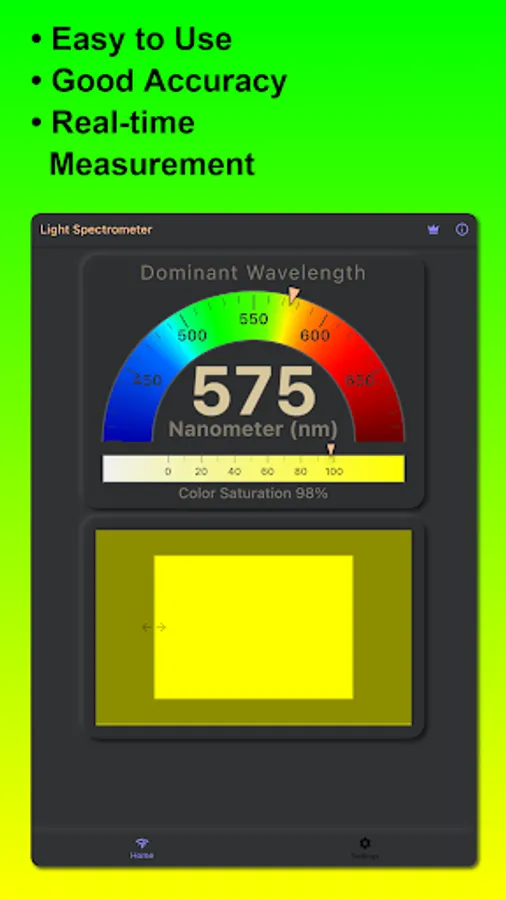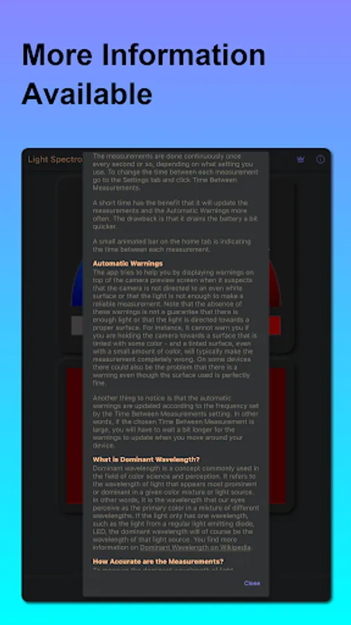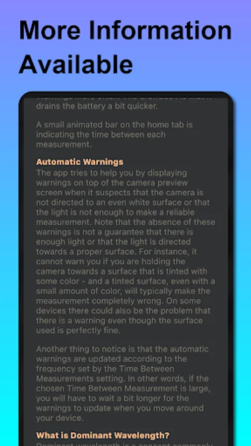 The app uses the advanced capabilities of your smartphone's camera sensor, combined with sophisticated algorithms, to as accurately as possible analyze the incoming light and determine its dominant wavelength. This technology opens up a world of possibilities, allowing you to delve into the intricate details of the light spectrum in our environment.
