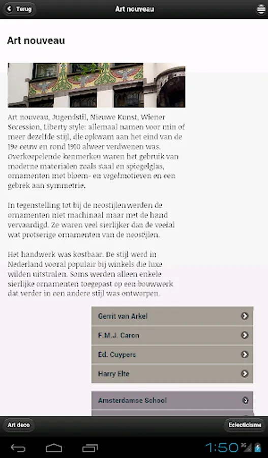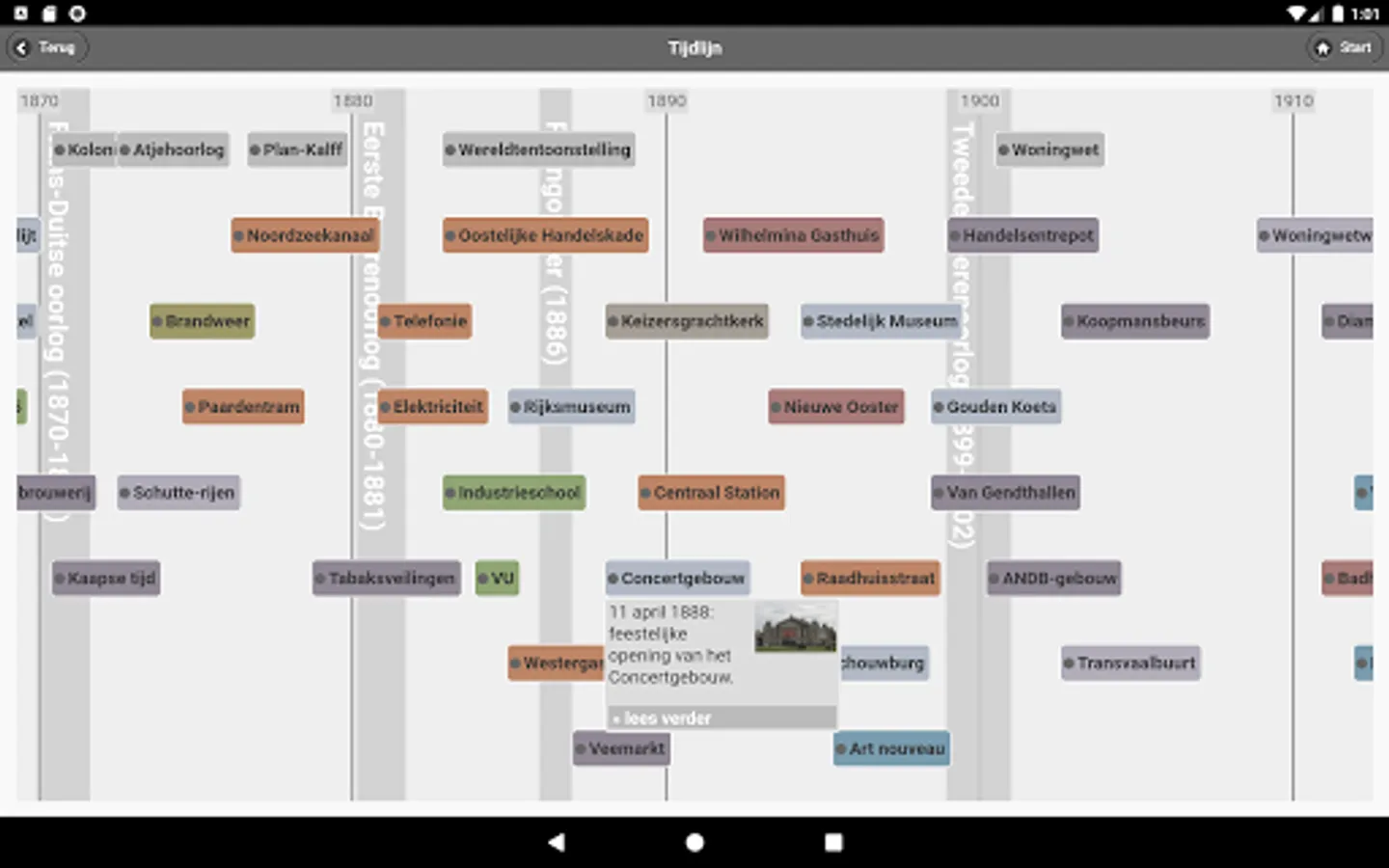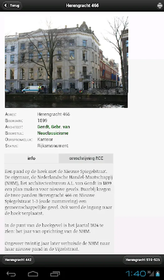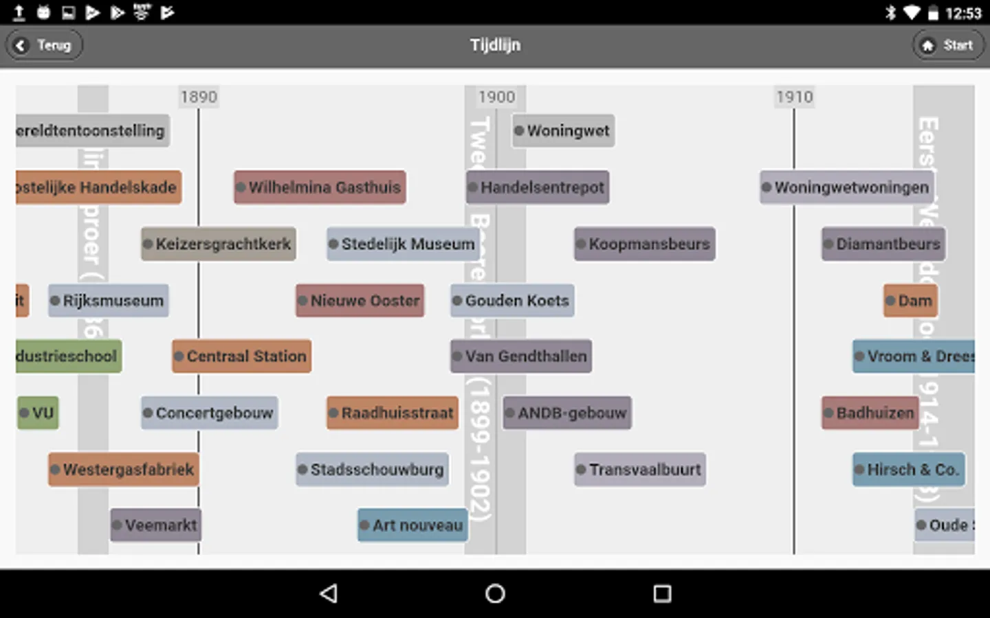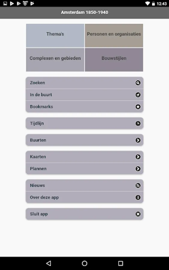 This app shows the development of Amsterdam between 1850 and 1940 based on thousands of buildings. More than 15,000 images show the work of well-known architects such as Cuypers, Berlage and De Klerk, but also of lesser gods such as the many nineteenth-century contractors. -architects. Cultural history is amply covered: in the descriptions of the buildings and in themes, including social housing, harbour, bathhouses, trams, cinemas, churches and schools.