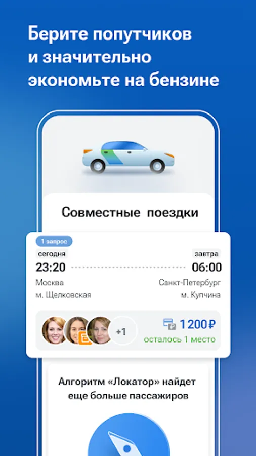 Drivers and fellow passengers share the costs between themselves in long-distance trips. A great way to get from one city to another by car and at an affordable price. Joint trips with fellow travelers by car will help save time and money.