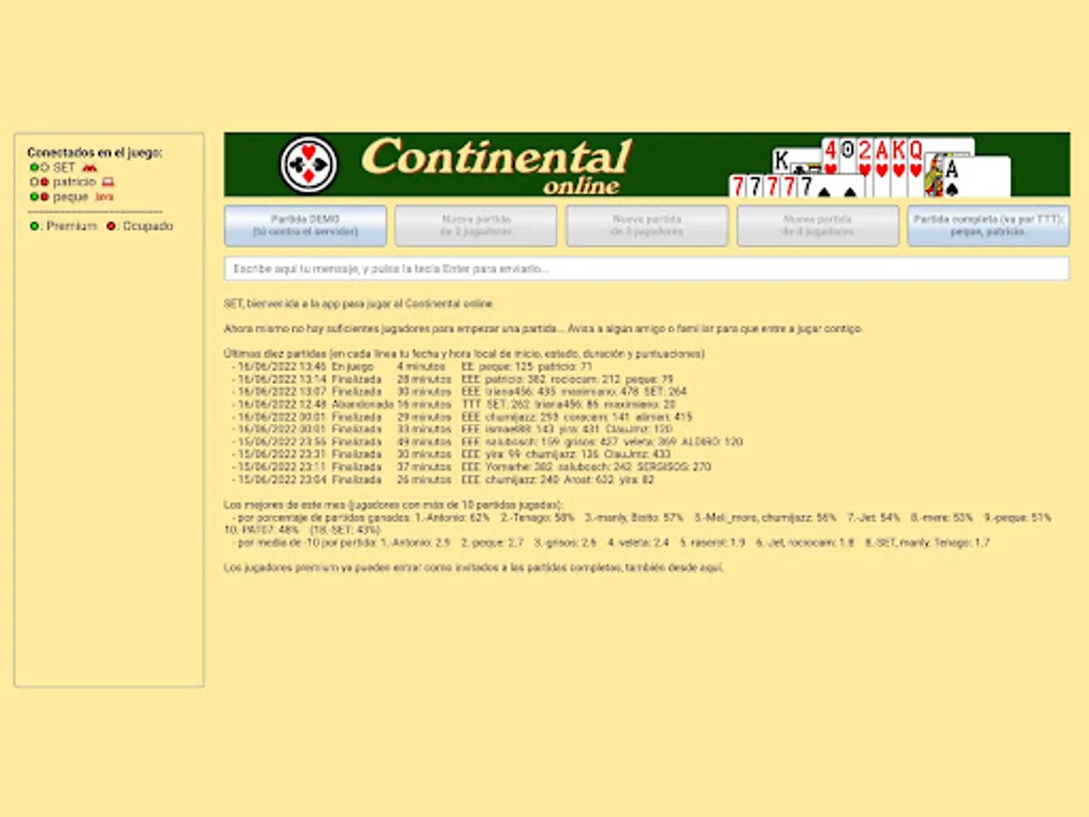 Continental is a card game for two, three or four players, which is played with two (or more) English decks and in which different combinations have to be made, as occurs in gin rummy, remigio, chinchón or the basket It has the peculiarities that the combination to be made in each hand is fixed and that it is allowed to steal "against" (taking the card from the well out of your turn, if it is not trodden on).