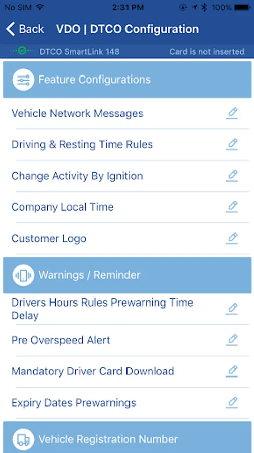 DTCO Configuration App is designed for Fleet Managers to configure the DTCO® 3.0 using their Company Card. With a Bluetooth connection via Smart Link multiple parameters can easily be configured inside the tachograph. This is a great advantage compared to former DTCO versions where such changes could be done only by workshop.