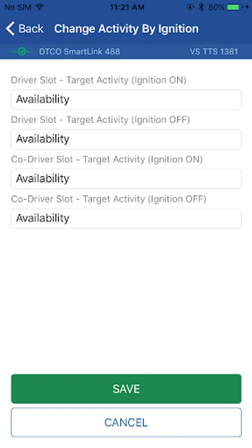 Set the activity for driver and co-driver when the ignition is on or off. Choose between BreakOrRest, Work, Availability and NoActivity.