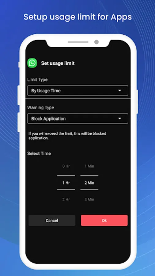 ➤ Break reminders: To encourage users to take breaks from their device, screen time tracker app offer reminders or prompt to take breaks after a certain amount of time has been spent on the device. For example, when you or your child is using WhatsApp, you can set block for WhatsApp usage after time exceed.