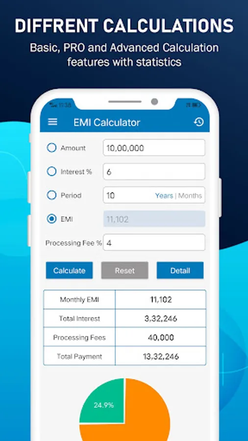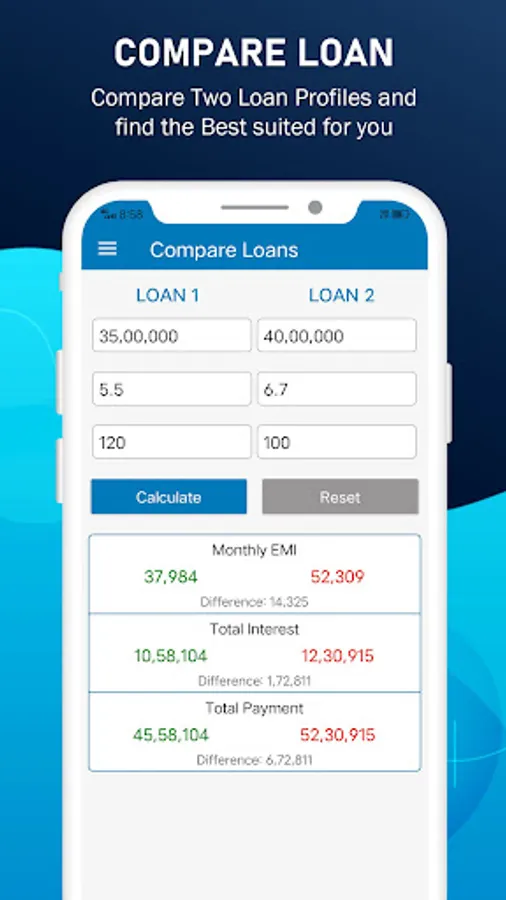 EMI Calculator is a simple loan calculation tool that helps the user to quickly calculate EMI and view payment schedule. Use this Loan EMI Calculator to calculate your EMI (Equated Monthly Instalment), plan your loan repayment in an effective way. You can also easy to compare two loans by using Loan EMI Calculator.