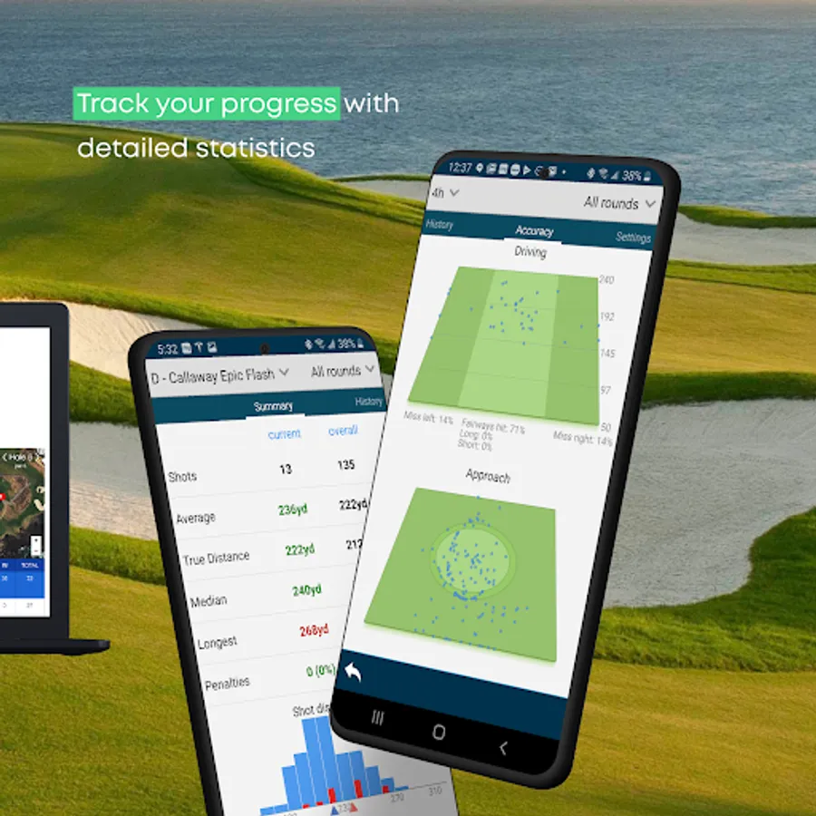 * Track your progress with detailed statistics, including scoring, putts, accuracy, penalties, fairways, sand, GIR and distance walked