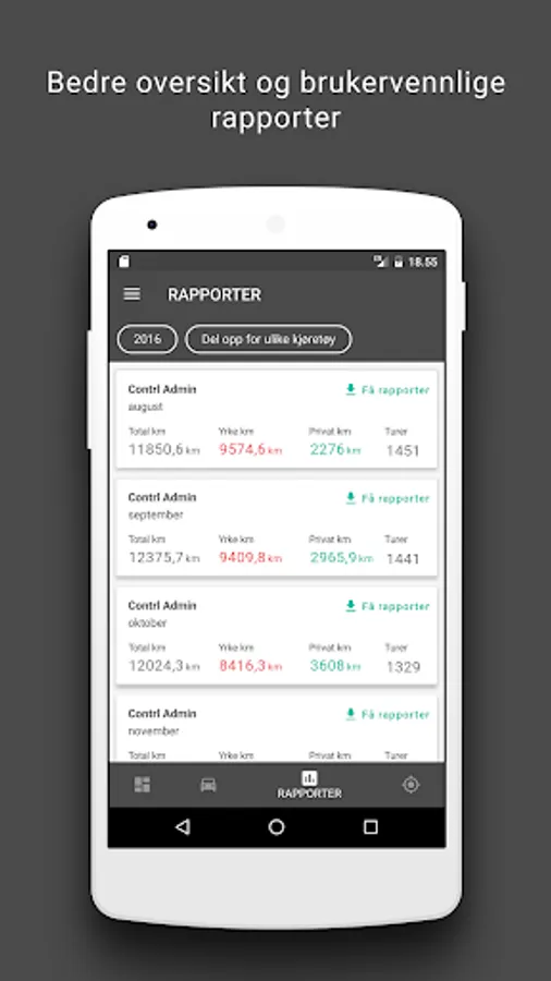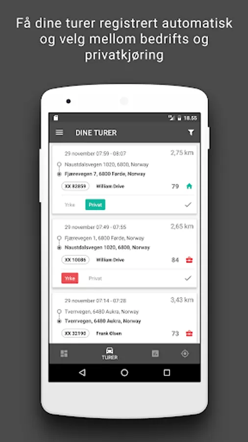 • Get all your trips on your phone and just with a swipe change trips between business and private