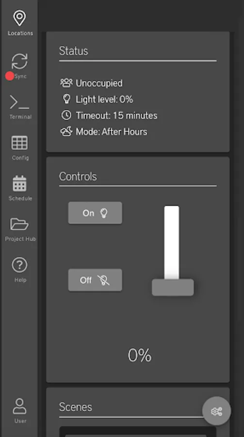 The Android mobile platform interface for the Amatis Controls wireless lighting controls solution enabling users to set light levels, call scenes, adjust lighting schedules, and make configuration changes via android devices.