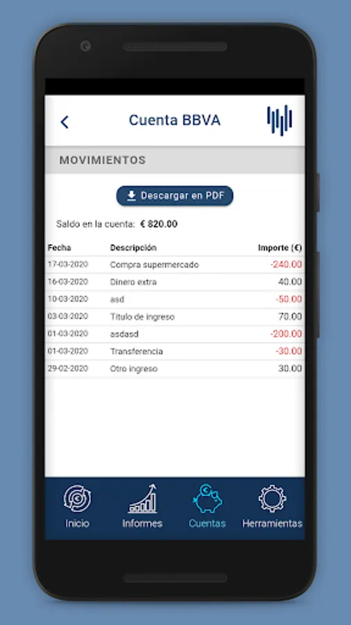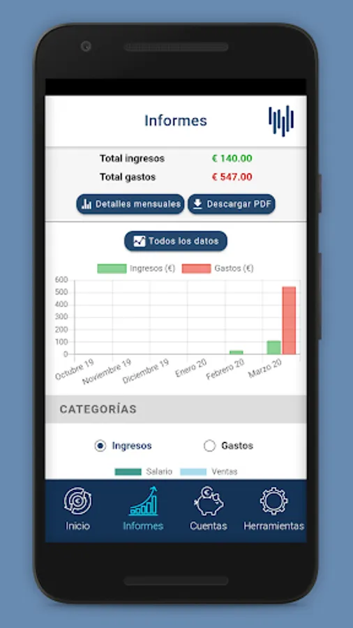 You will have a detailed report of all income and expenses throughout the months, in addition to being able to see them separated by categories and accounts, and broken down monthly. You can also download all the reports, both monthly and annual, in PDF.