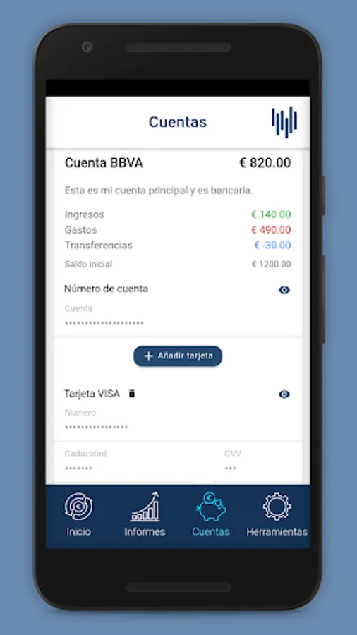 You can have all your accounts with all their information. In addition, in bank accounts you can save the full account number and the number and information of different cards associated with the account. This information will be saved encrypted and you can see it by putting your password or your pin. With a simple button you can copy the account number or the cards. You will also have a section where you can see all the movements of an account.
