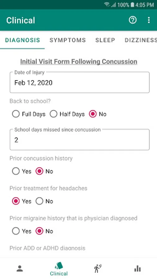 Additional clinical tools and surveys allow for initial concussion diagnosis, finger reaction times, surveys for pain, sleep, dizziness, and symptoms.