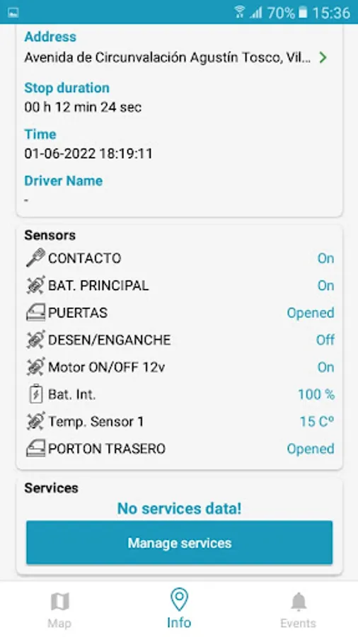 Vehicle tracking application. Monitoring of sensors: contact, doors, panic, gate opening, temperature, obd2, etc.