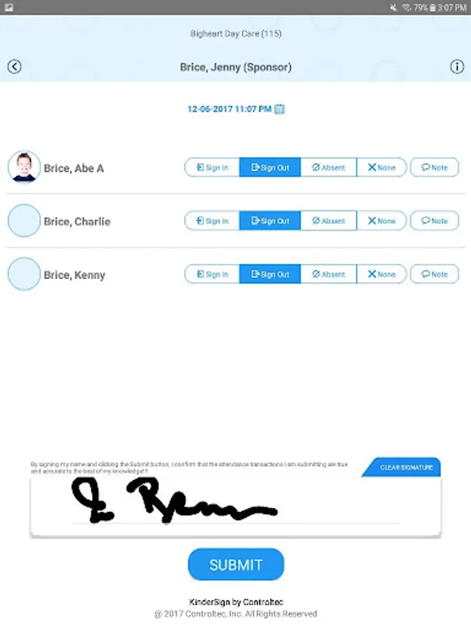 KinderSign is a mobile app for tablet devices to allow parents and other authorized adults to sign children in and out of care at the childcare provider. All authentication information is instantly available in the system, for up-to-date queries about children in care. Time stamp information is available for time-and-attendance tracking, reporting and of course eventual provider reimbursement.