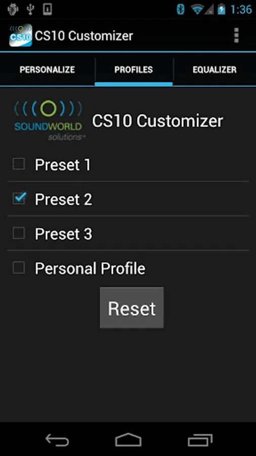 The "Profiles" tab gives you the option of setting your CS10 to one of the three preset listening profiles, or your personal profile. Once you have selected one of the profiles through the app, the program button on the CS10 changes modes and can be used to toggle between your baseline profile and two additional settings designed to optimize the performance of the CS10 in specific situations.