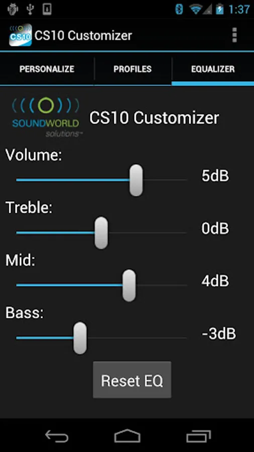 The app also provides an "Equalizer" tab with sliders to adjust individual settings for treble, mid, and bass frequencies for a truly customized user experience. There is also a slider to adjust the volume, similar to the volume button on the CS10.