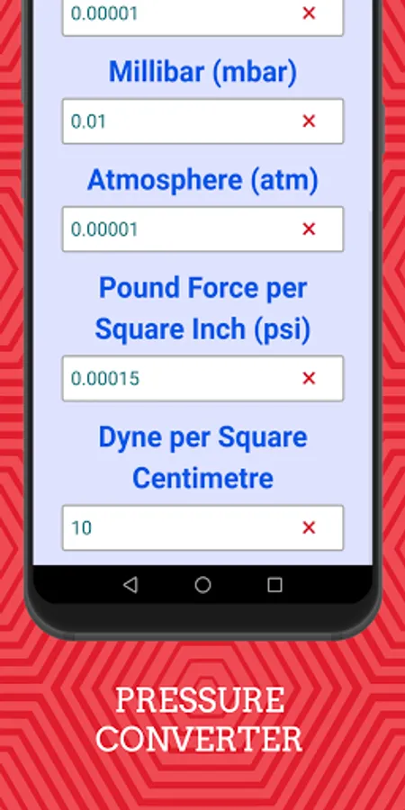 I)The Pressure Converter App converts the major 8 units of pressure to Pascal, Kilo Pascal, MegaPascal,Bar, Millibar, Atmospheric pressure(atm), Pound force per square inch (psi), and Dyne per square centimeter.