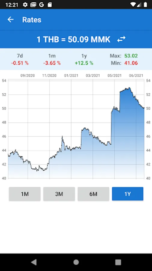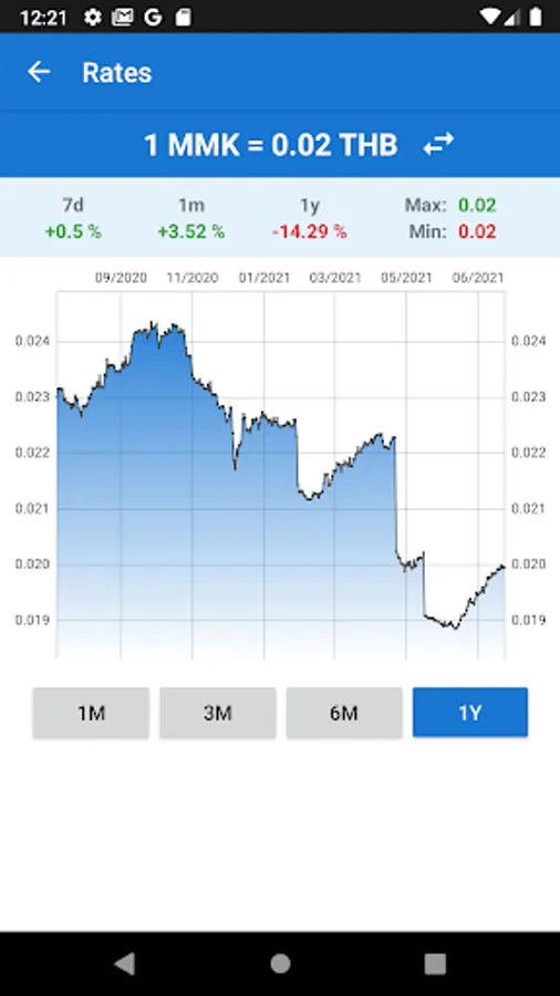 This application also allow you to see the chart with the historical exchange rates between Thai baht and Myanmar kyat . Rates variations from the last week and months will be displayed and the highest and lowest rates.