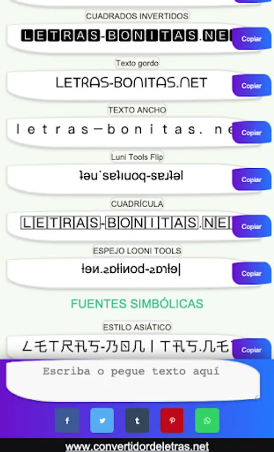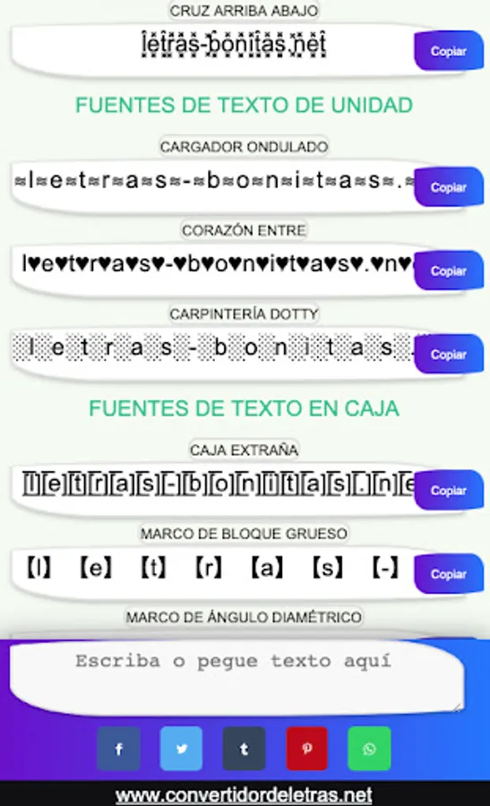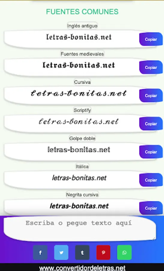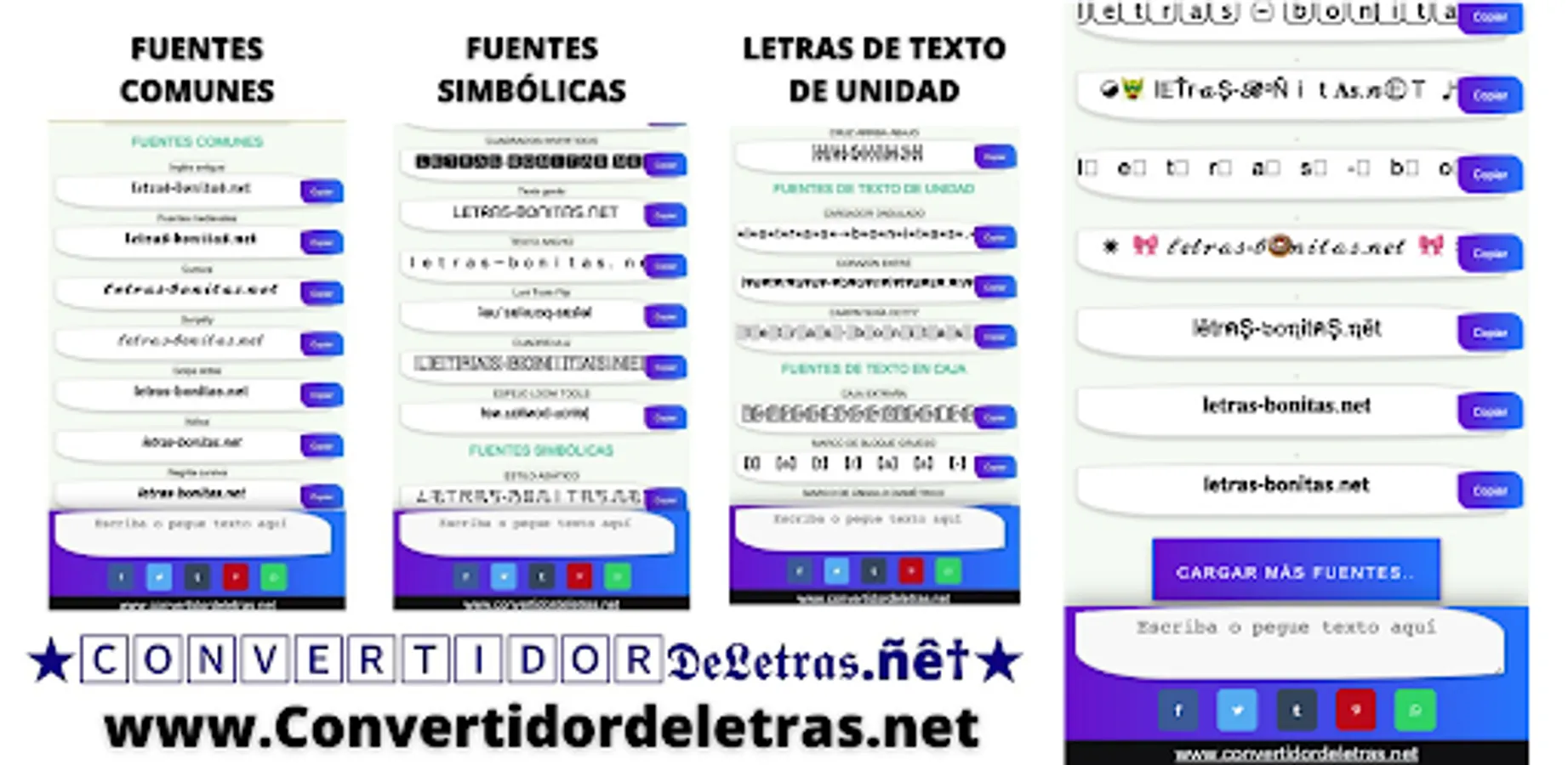 convertidor-de-letras.net es el mejor sitio web y el número uno para generar diferentes tipos de texto con estilo letras . Usando este sitio web de convertidor-de-letras Generator, puede generar fácilmente un texto atractivo 𝐋𝐞𝐭𝐫𝐚𝐬 letras puede simplemente (Haga clic para copiar) la fuente del texto y puede pegarla fácilmente en cualquiera de las plataformas de redes sociales como Whatsapp, Facebook, Instagram, Twitter, etc.