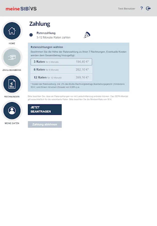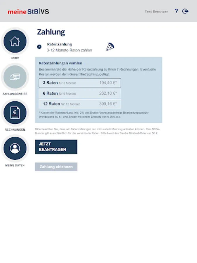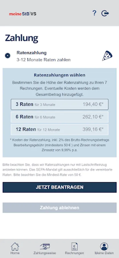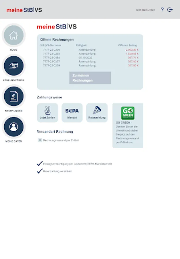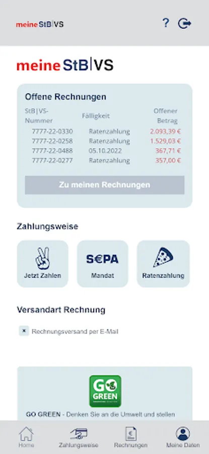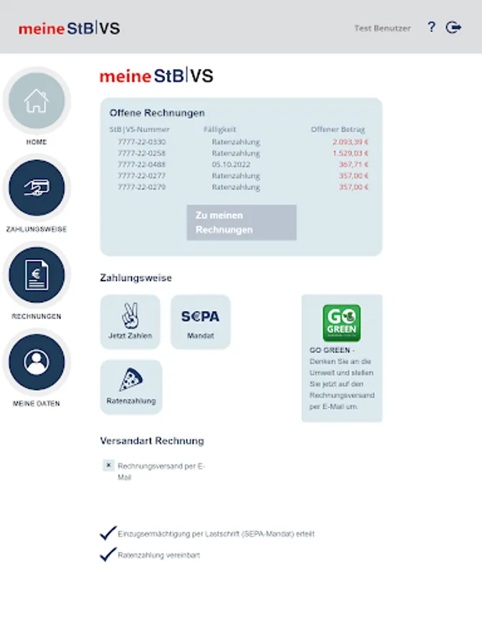 meine StBVS offers you flexible payment options and an overview of all your open and paid invoices bundled in one place. Pay your bill easily and conveniently with a click, arrange payment in installments or pause your payment. You can also use the app to send us questions easily and digitally using the contact form or request duplicate invoices, among other things.