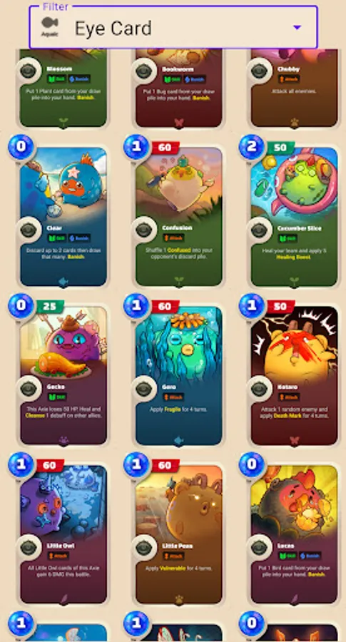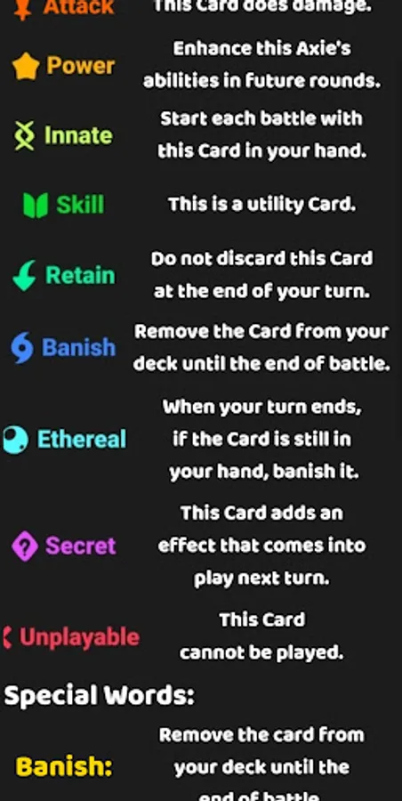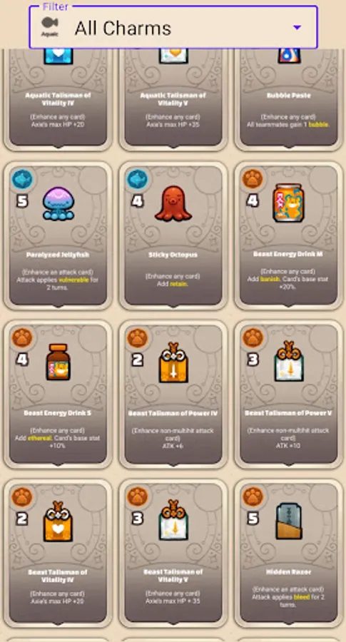 All Axie Origin Card v3, Runes and Charms, Buffs and Debuffs, Tags and Special Words will show you on this app.
