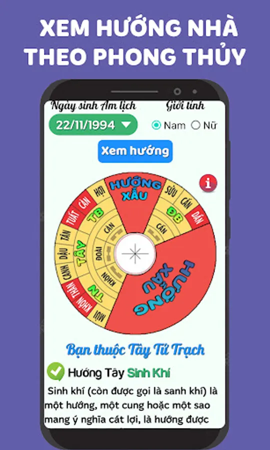 - See the direction of the house based on the lunar year of birth (Eastern Tu Trach or West Tu Trach) infer the direction of Sinh Qi, Thien Y, Dien Nien, Phuc Vi, Tuyet Menh, Ngu Quy, Luc Sat, Hoa Har
