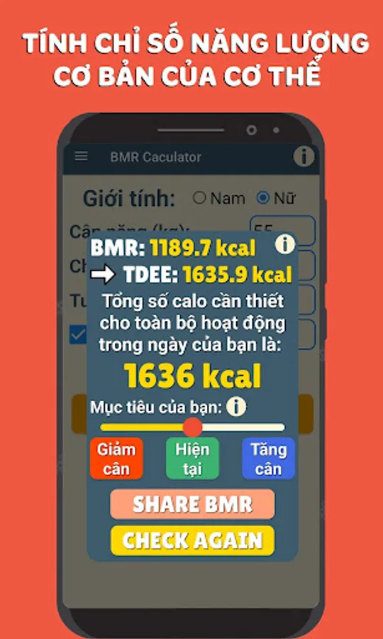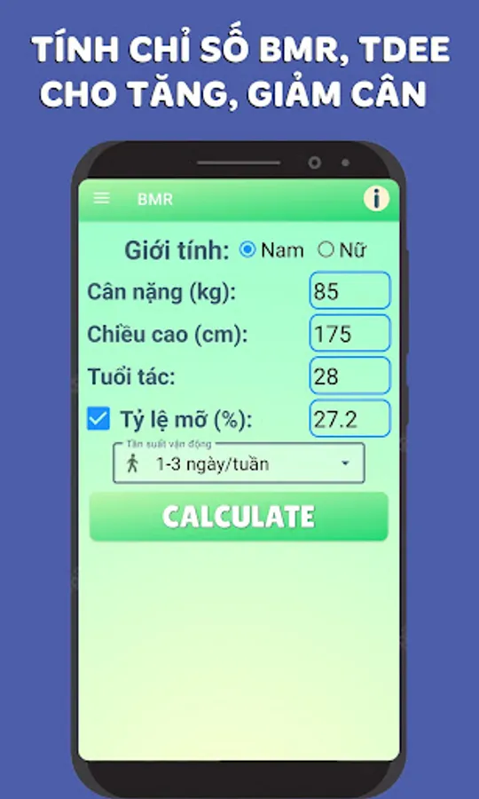 - BMR tool: calculate the body's metabolic index and TDEE is the total number of kcal needed for your activity in 1 day. Choose to gain weight or lose weight so that the tool gives you a number for you to achieve when performing exercises.