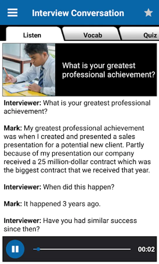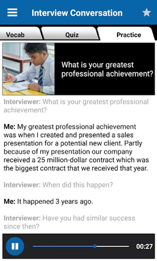 Interview Conversation Practice includes 240 conversation lessons. Each conversation covers one important English job interview question. You can listen, read, learn key vocabulary, and even practice speaking. The Conversation Practice Feature helps you get valuable speaking practice for English job interviews.