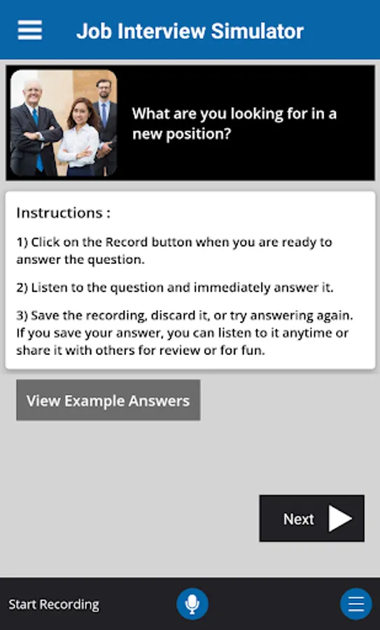 The Job Interview Simulator helps you prepare by simulating a job interview in English. The simulator asks you common English job interview questions randomly. Answer these questions with your own answers in real-time, just like a real job interview! This method will help you prepare for your interview and improve your spoken English. You can also view example answers if you need help or ideas on how to answer professionally.