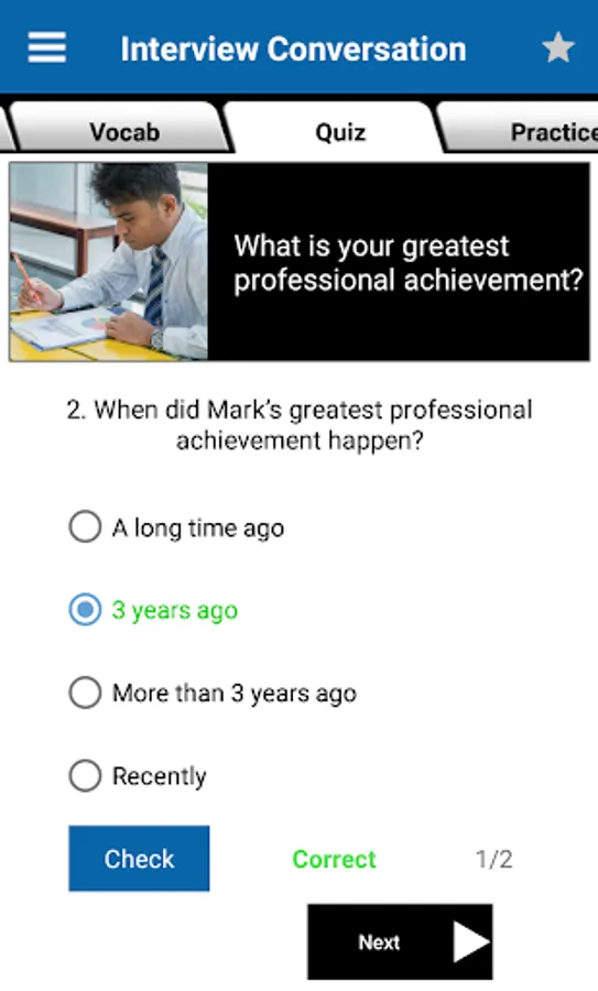 It is difficult to practice speaking English on your own. It is also difficult to prepare for a job interview in English and learn business English. But with this app, you can do all three!
