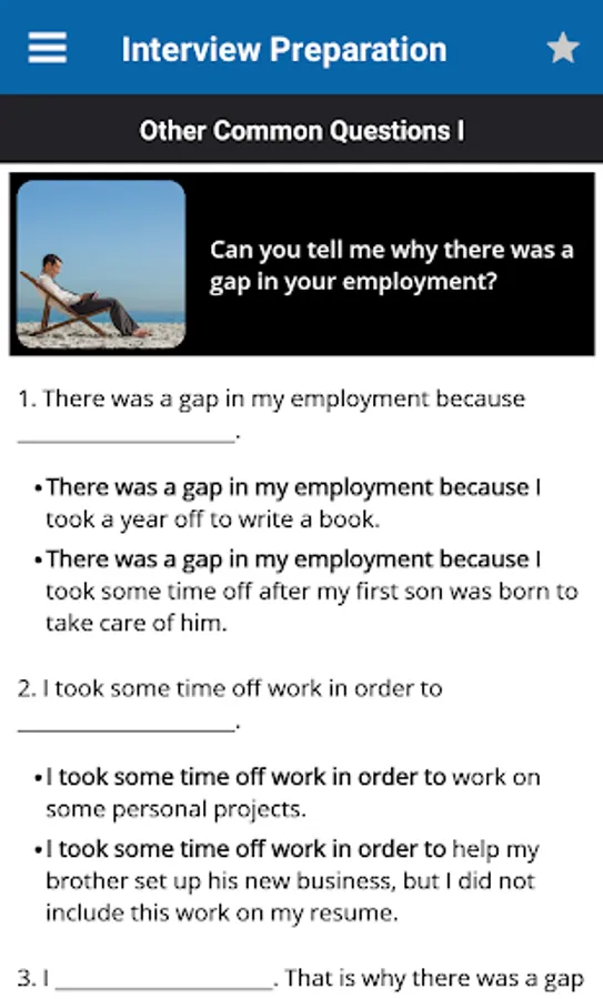 Interview Preparation has 200 lessons that show you how to answer common English job interview questions. These lessons provide sentence patterns to help you create your own answers in English and also show you example answers to help give you some ideas about how to answer the English interview questions fluently.