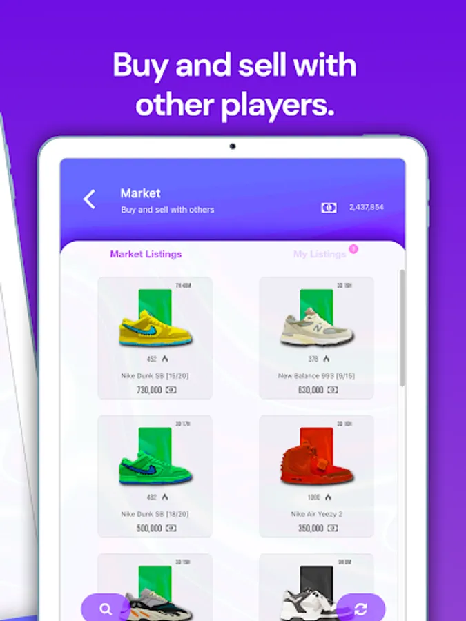 Invest your hard-earned coins in purchasing packs, taking a chance to score the rarest kicks in the sneaker game. Trade, sell, or buy sneakers from fellow users through our dynamic sneaker game marketplace.