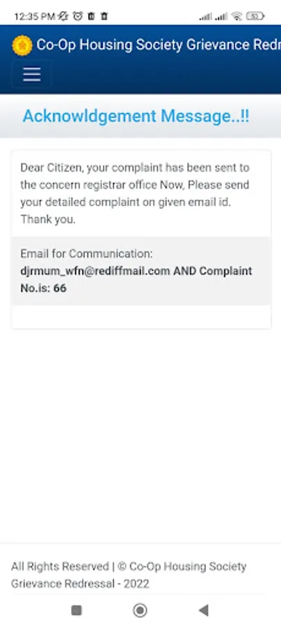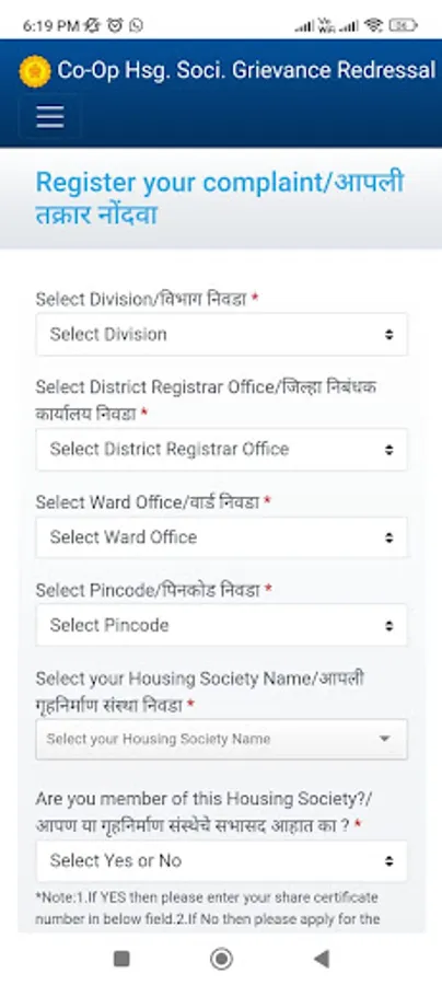 Full description *:The app is all about grievance /complaint system for co-op housing societies to the divisional registrar office of MCGM region. The members of registered societies can raise the complaints which are pre defined. The raised complaints sent to the concern officers of related area's covered in MCGM region. After the submission of complaint society member get the acknowledgement of the complaint.