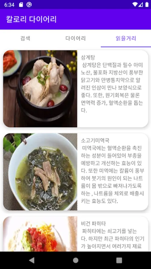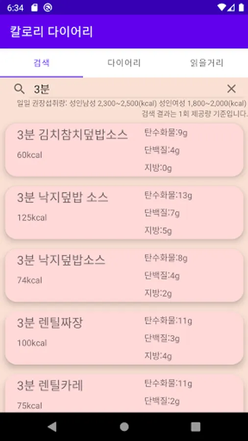 Find the food you're looking for in the'Search' tab. Provides per serving or per serving calories and nutritional information such as carbohydrates, protein, and fat. Right next to the'Diary' tab, log and manage your journal on any date. In the'Reading Things' tab, information and stubs such as the efficacy of everyday foods are included.