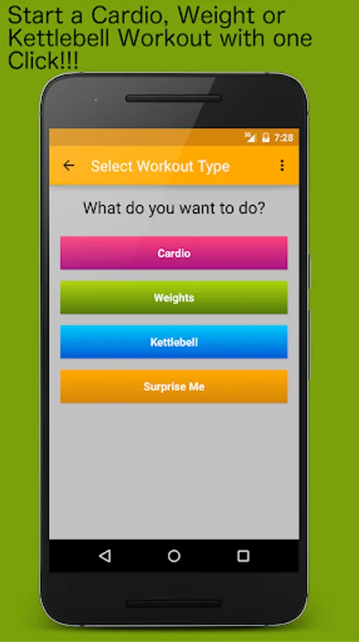 - CHOOSE WORKOUT TYPE: Tell the app whether you want a cardio, weight lifting or kettlebell workout. Alternatively click “Surprise Me” for a random choice among the three.
