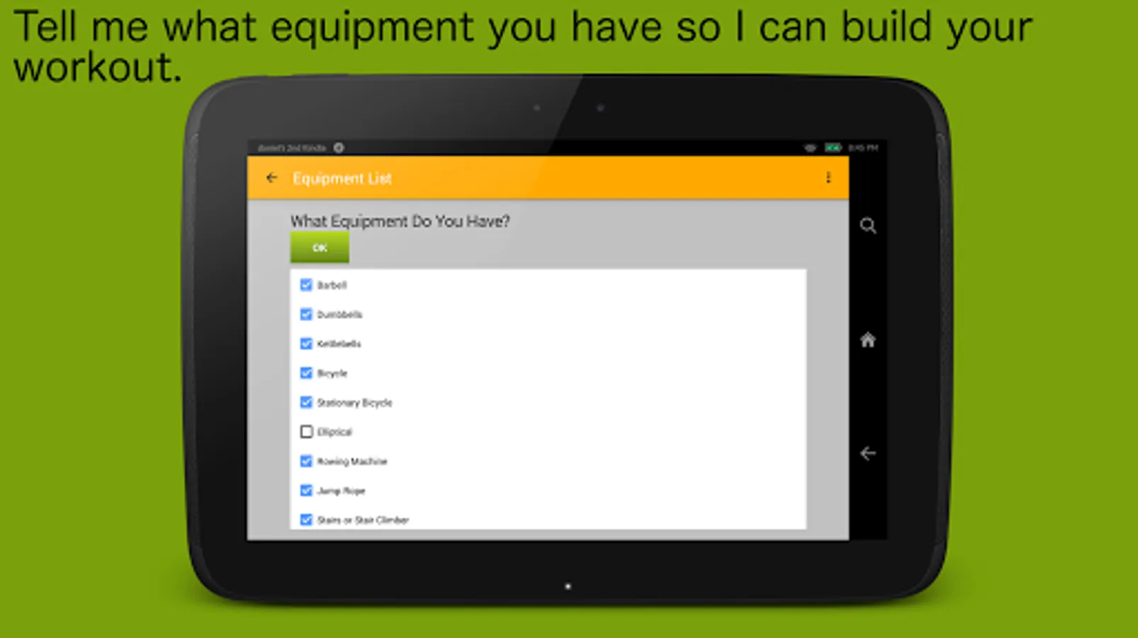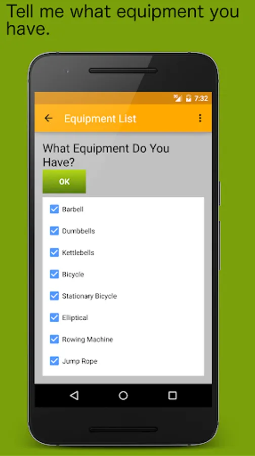 - SELECT YOUR EQUIPMENT: Tell the app what equipment you have available for your workout (barbells, dumbbells, dip bars, chin up bar, leg press machine etc.)