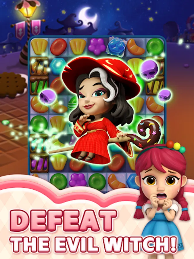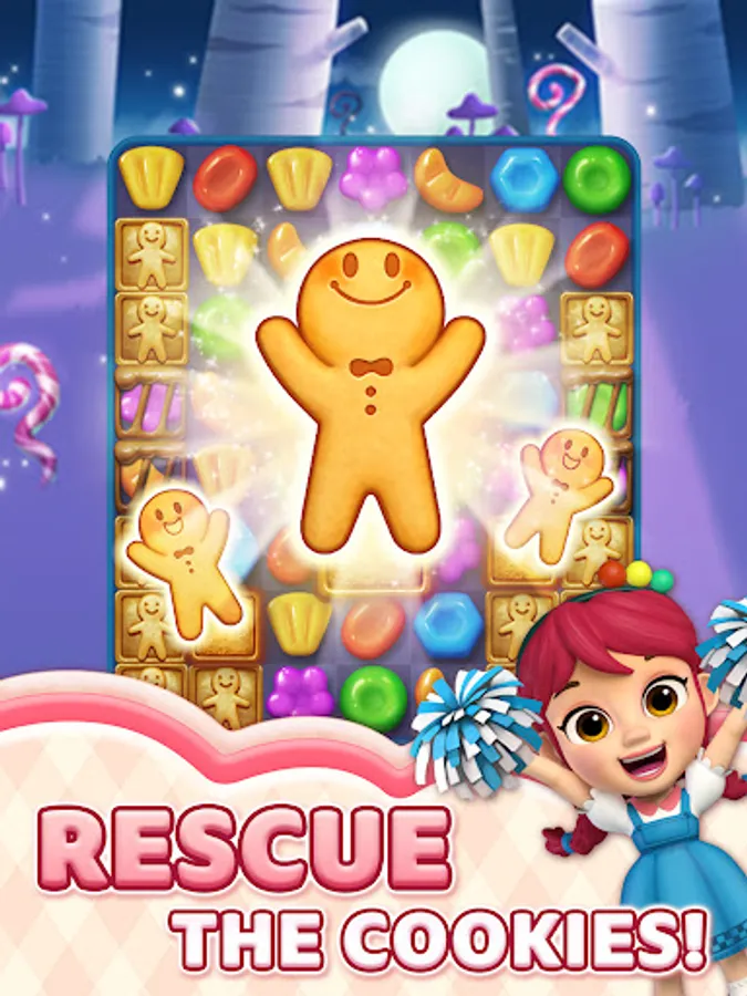 Help Gretel rescue Gingerbread men to protect sugar desserts - candy, lollipop, chocolate, gummy jelly, and cookies - from the villain witch! Play and crush lollipop match three puzzle game! Are you ready for a tasty, yummy cookie rescue journey of candy sugar match 3 game?