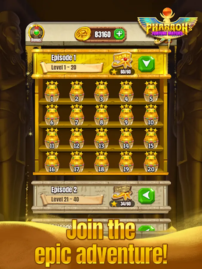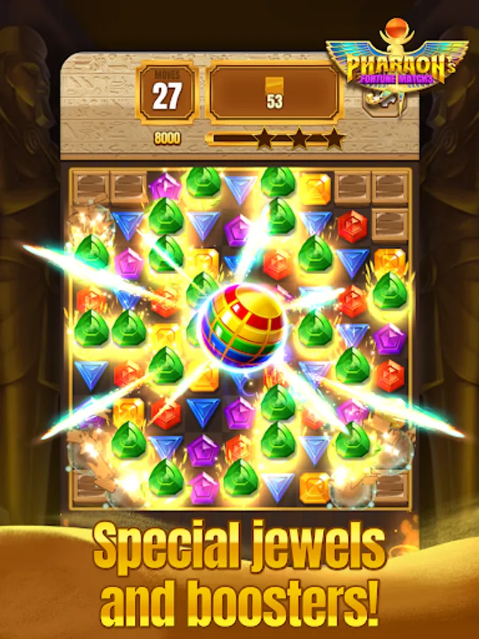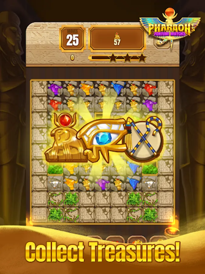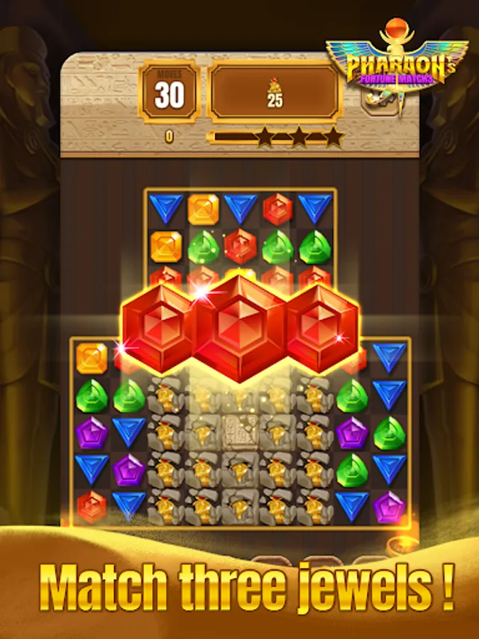 Pharaoh's Fortune is a classic matching game set in magic Egypt. Quest into the Pharaoh's tomb and discover the trove of gems and jewels hidden within. Blast, match, and crush jewels and gems in fun and exciting gem matching games and puzzles to collect magic stars and earn the Pharaoh's favor.