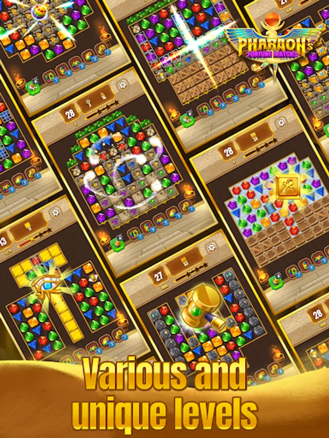 Solve hundreds of clever match 3 puzzles, crush gems and jewels, and succeed in your quest to earn the Pharaoh's Fortune!